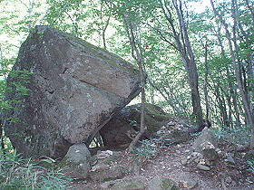 歩き始めてすぐのところにある沢と ほんとに人が入れてしまう 雨宿りの岩。 |