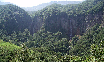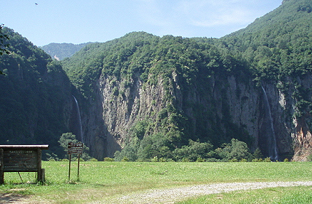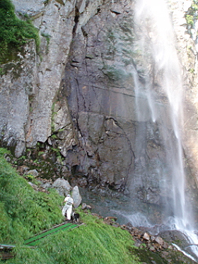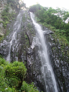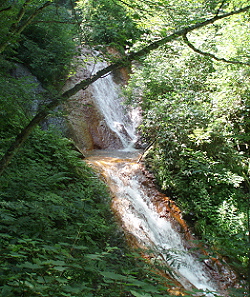 落差60m、滝壺まで行けますが 近づくと迫力満点。 それにすごい水しぶき。 不動滝とともに マイナスイオンがいっぱいです。 硫黄分や鉄分で岩肌が赤くなっています。 |