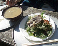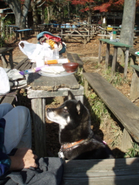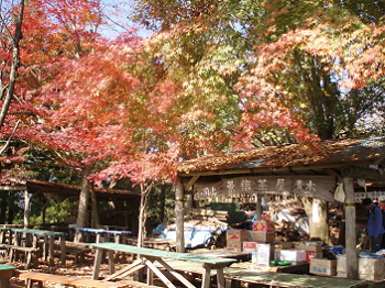 | がんばって歩いてきたご褒美は 富士山・紅葉 そしてキノコ汁と野草の天ぷら この上、陣場方面から来るとぶつかる 景信小屋にも色々あります。 |