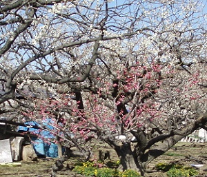 甘酒、おでん、おそばなどの茶店もでてました。 梅の木の根元には金色の福寿草 |