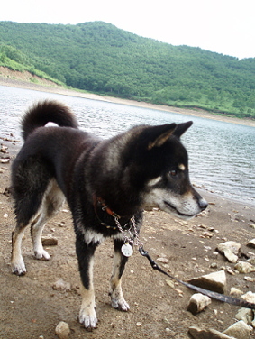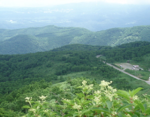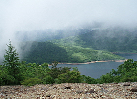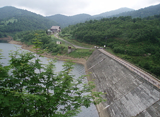 野反湖は人造湖。 ここから見るとよくわかります。 高さ44メートルのロックフィルダムで、東京電力が管理しています。 奥の建物は野反湖ヒュッテ。 第6駐車場があります。 |