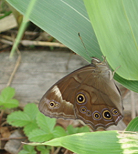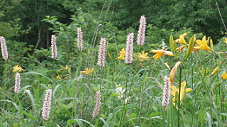 | キスゲの花に囲まれた湖畔の遊歩道。 |