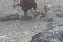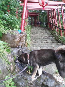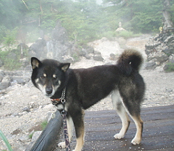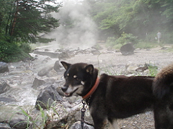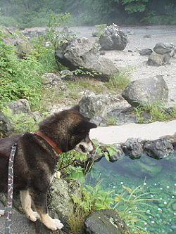| 硫黄のにおいが花凛には強すぎたかな。 ワンコの足湯にちょうどいいみたい。 花凛は水音に最初は近づいていったけれど 嫌がって入りませんでした。 きれいなエメラルドグリーンです。 |